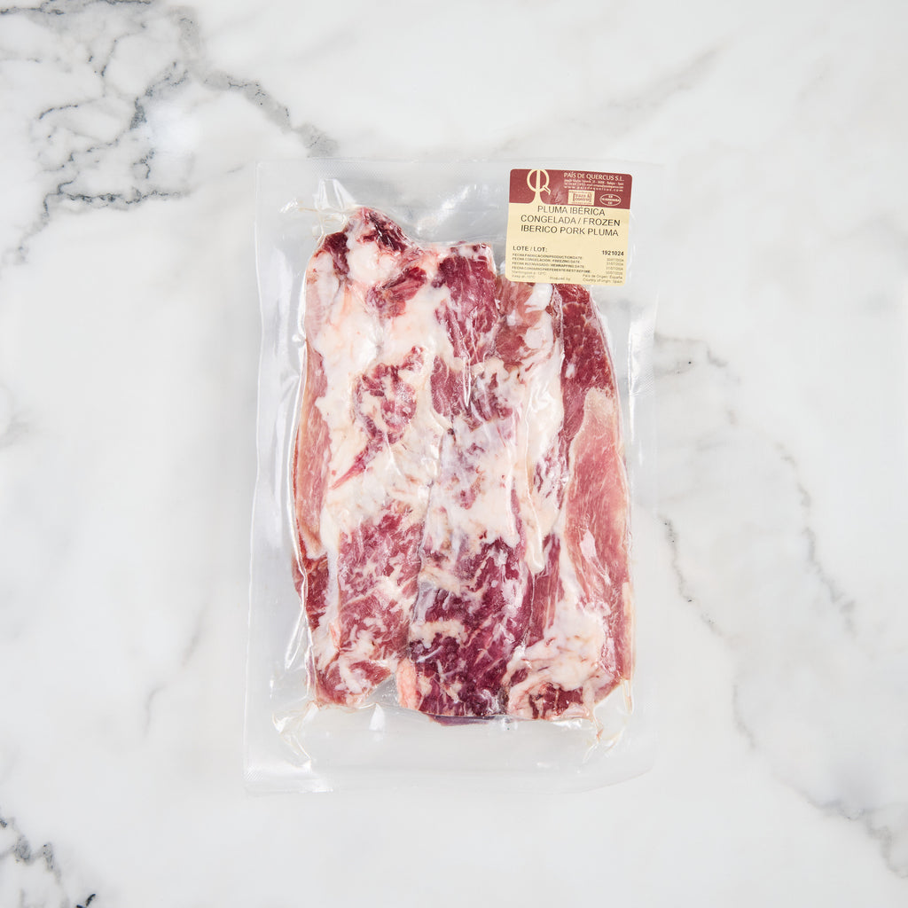 The Pluma: is one of the rarest cuts on the Iberico, with just under 800g on an Iberico Pig that weights over 180kg. To illustrate where this cut is derived from an iberico loin. We would draw reference to a Wagyu Ribeye. But only the most well marbled and tender section of the Ribeye -the Spinalus Dorsi. A thin triangular shaped muscle that is without a doubt the most prized cut on the loin.